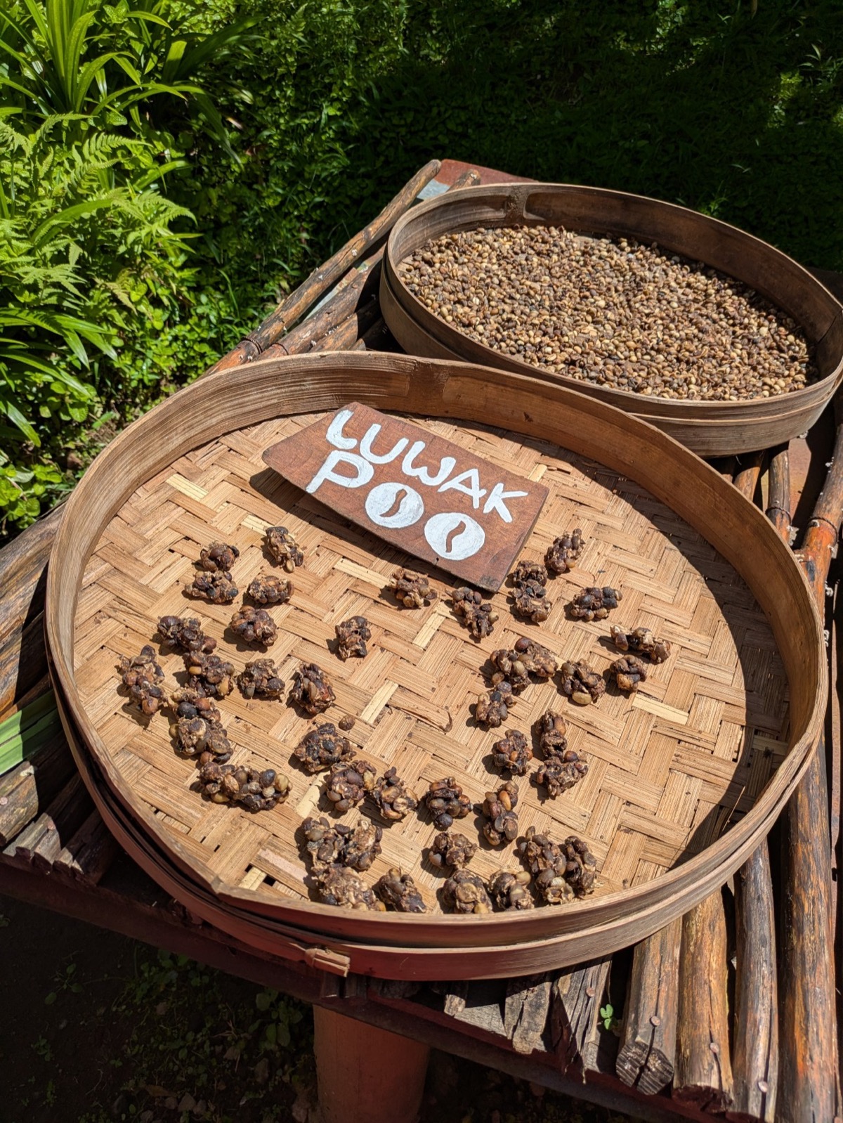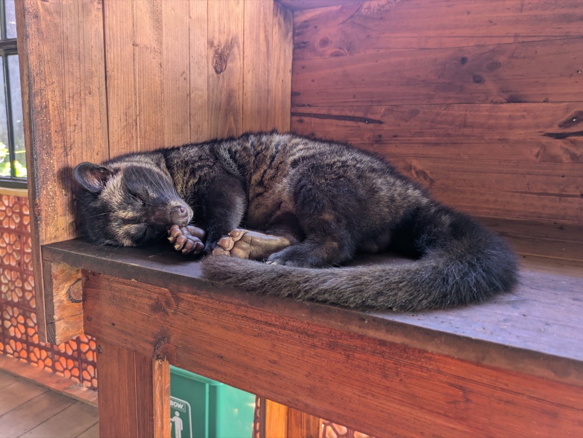 We were also shown how the Ludwak coffee is made, which if you don’t know is made when a Luwak (a civet animal) eats coffee beans and poops them out and then the use them for coffee. Now I did a lot and I mean a lot of research about the ethics around Luwaks because to be honest there are big issues in Bali with this. I learnt about the signs of Luwaks that are looked after and what to look for. I also read that you should support businesses that look after their Luwaks but never buy the Luwak coffee as that’s what keeps the bad care routines in place. Anyway sorry for the rant, but this place had a sleepy little Luwak out in the main restaurant. He was looked after, you were not allowed to touch him and he was just having his sleep. (They are nocturnal) He was an absolute darling. My friend Dani who I was messaging said he looked like a raccoon but in a different font which I thought was a very accurate description.