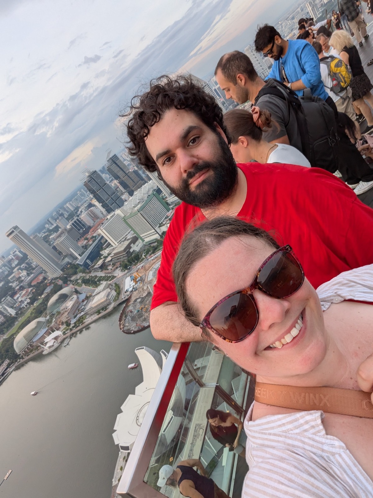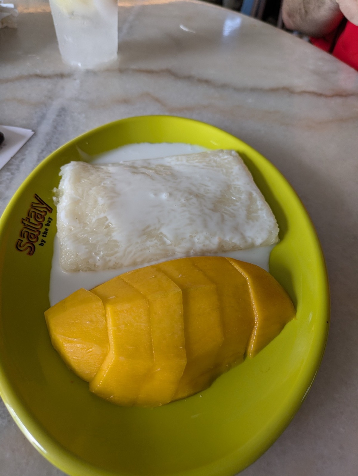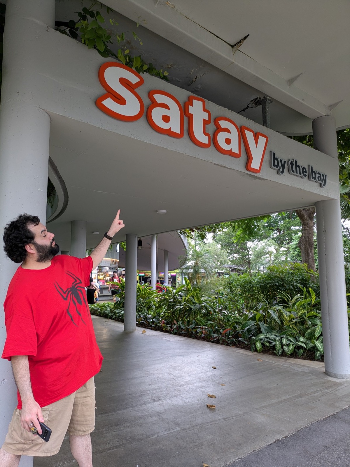 After a lot of walking (already up to over 7km at this point) we headed down towards Satay by the Bay for a late lunch. Anth was in charge of food ordering and I was in charge of drinks. When we met back up we had Pork Belly satay sticks, carrot cake (in Singapore this is not a desert nor does it have carrot. It’s a delicious turnip stir-fry dish) and Mango sticky rice. I got us 2 pineapple and Rambutan sodas. The pineapple pieces were inside the Rambutans. All of the food was a little more expensive here but it was delicious. We had booked to go up Marina Bay sands tonight so we decided to do a quick grab ride back to the hotel to rest and charge our phones.