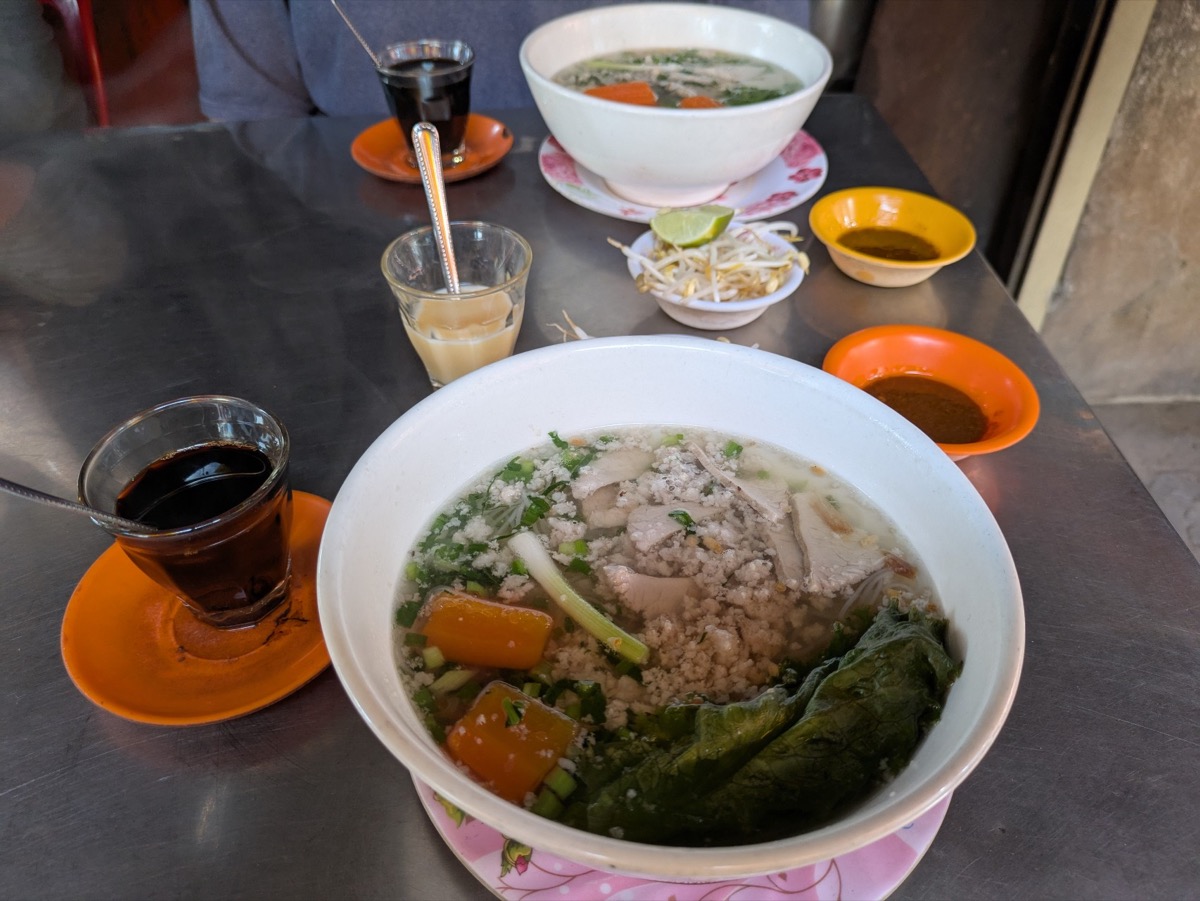 Our first stop was at the neighborhood breakfast shop that has been operating for over 15 years. We got some coffee with condensed milk (I had to add a lot in) and Num Banh Chok- Cambodian Rice Noodle Soup. To his is a traditional Cambodian breakfast and was pretty delicious.