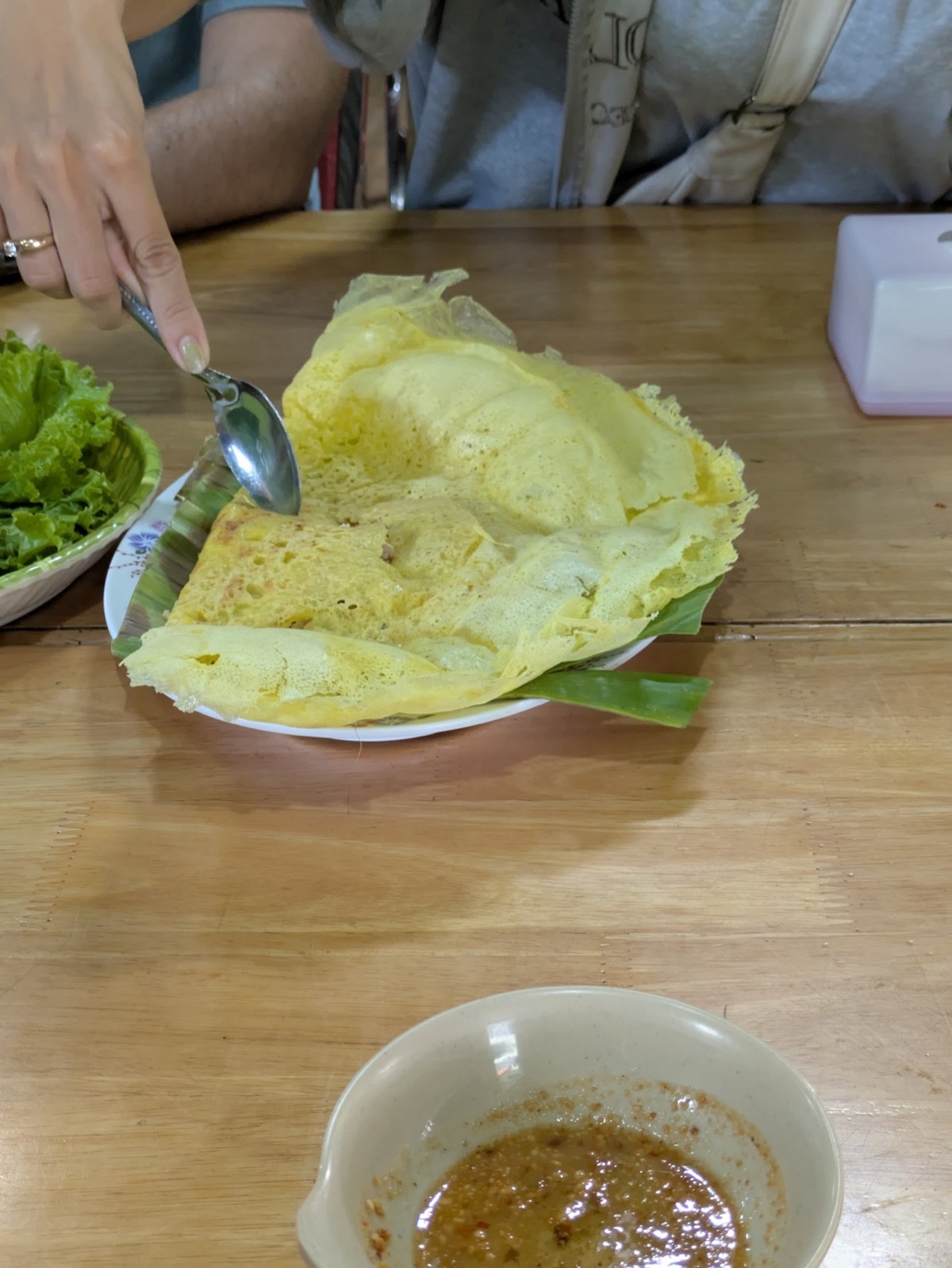 We stopped again at a place selling savoury tumeric pancakes made with rice milk and turmeric, which give them their vibrant yellow color. Then they’re stuffed with ground pork, bean sprouts, and dried shrimp the you wrap them by hand with lettuce. These crepes were not my favourite but they are based off an old Cambodian tale and tradition which I think is amazing.