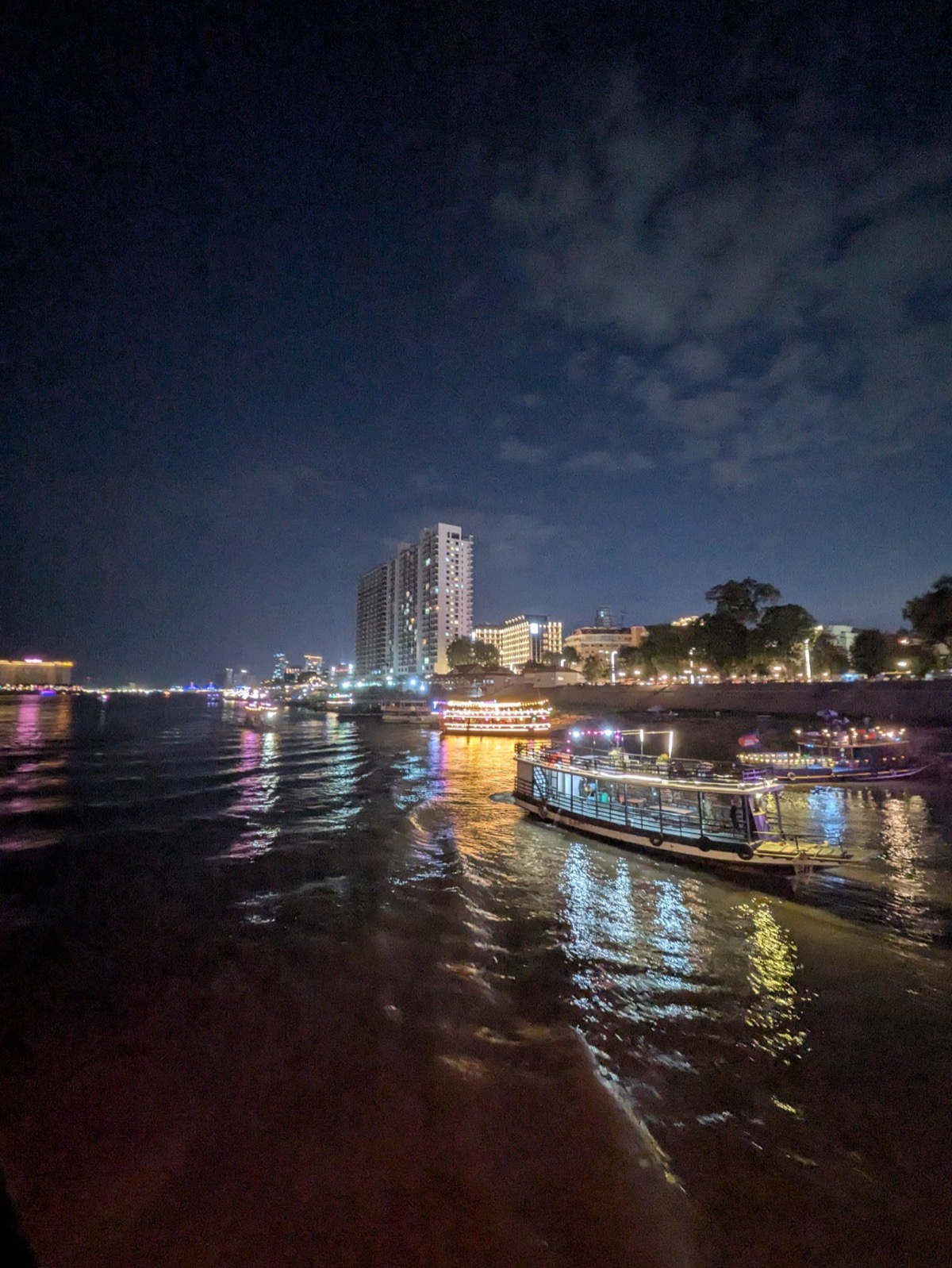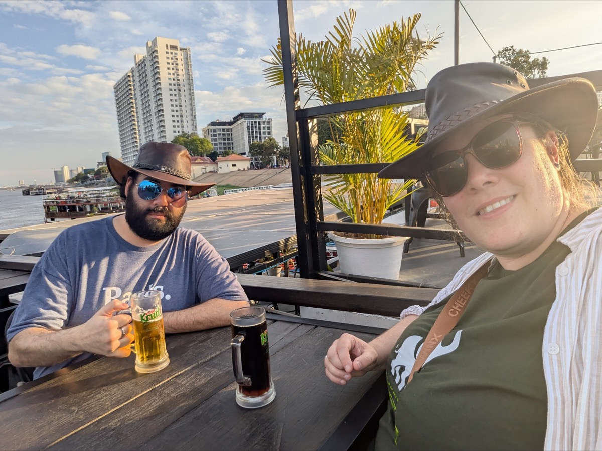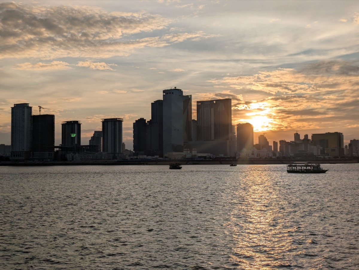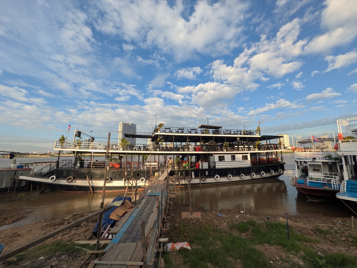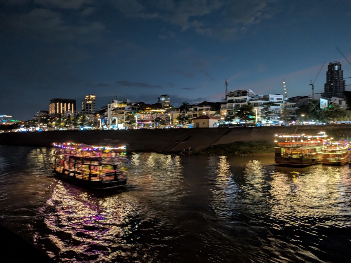 We got picked back up at 4.30 and taken to a boat down on the Tonle Sap for a night tour that would take us on the Meekong and the Tonle Sap for sunset. Interesting fact about the Tonle Sap in is that the Tonle Sap is the only river in the world that flows both ways seasonally, reversing direction twice a year. Which is crazy. The cruise was beautiful and the views stunning and before we knew it the sun was setting and we were relaxing with free drinks on the ship! We also met some lovely ladies from Denmark who we had gotten talking to on the Tuk Tuk ride on the way to the boat so we spent the last part of the cruise chatting to them.
