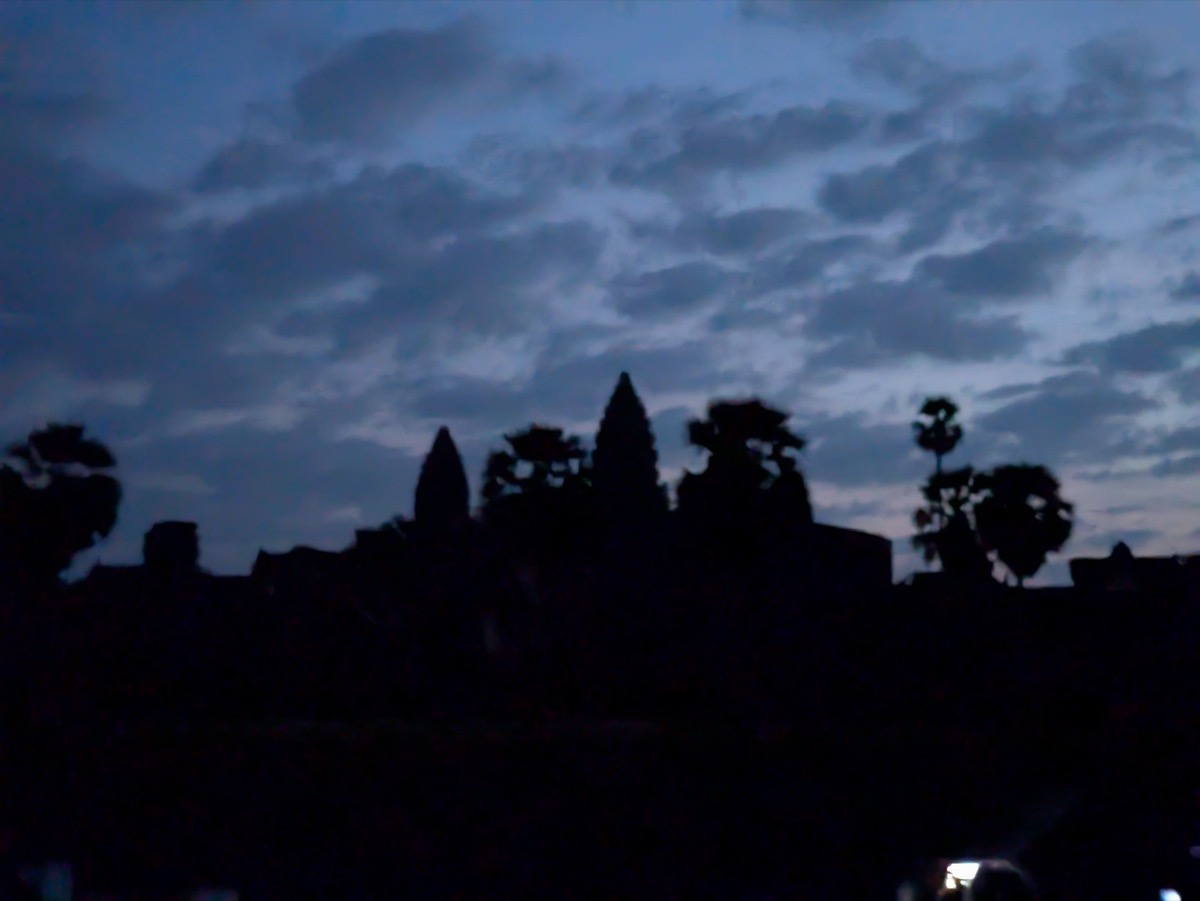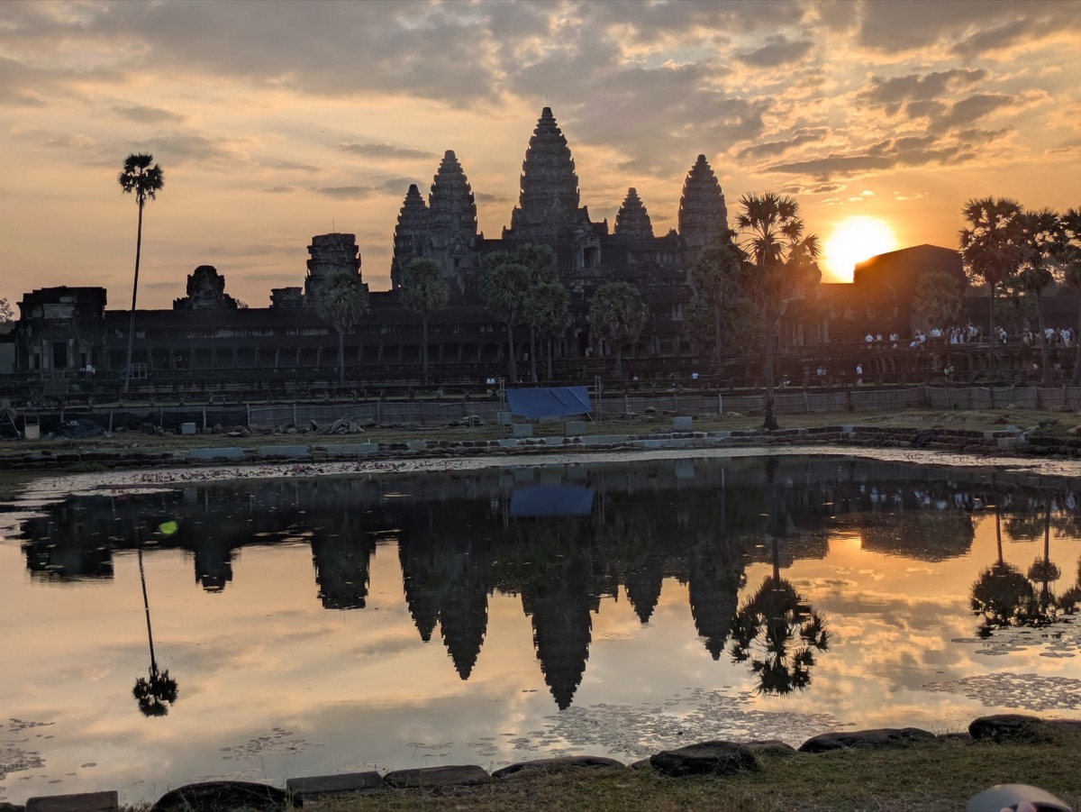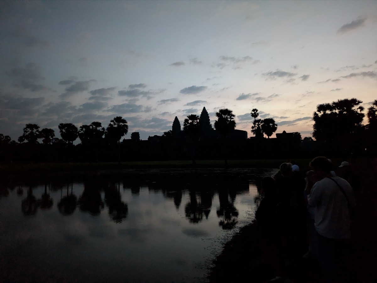 Anyway 5am it was pitch black and we were in the back of a Tuk Tuk going through the jungle. We arrived at Angkor Wat. Walking in the dark through a 900 year old temple you can not see at all is a strange experience. We walked down to the pools and started watching the sky change colour and reveal Angkor Wat it was so beautiful. There were so many people here but it didn’t even matter. After it had lightened the sun came up over Angkor Wat and made it beautiful. It was worth the early wake up call.