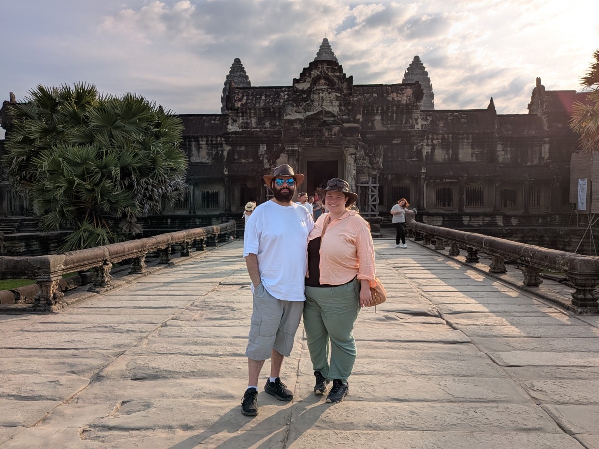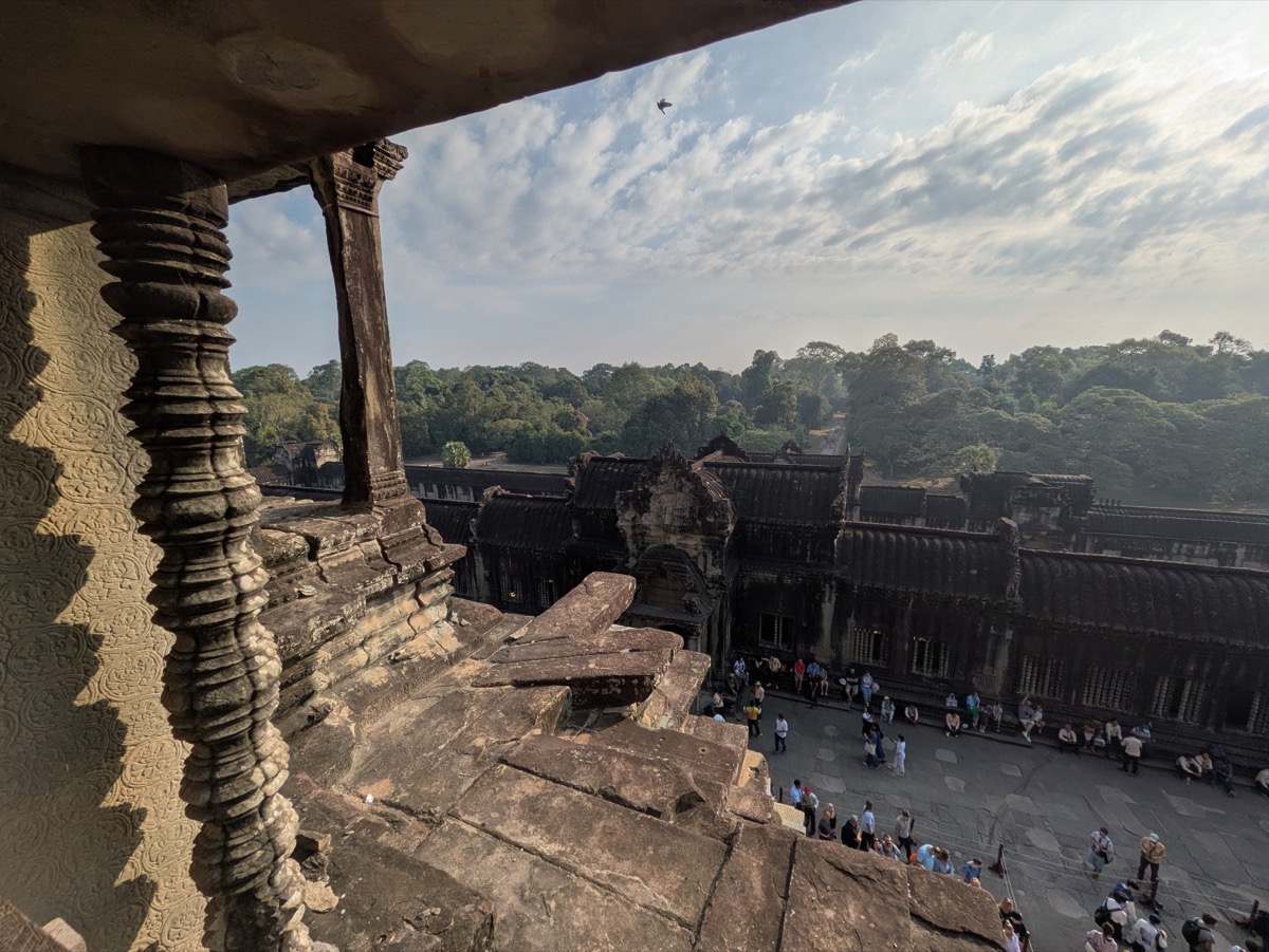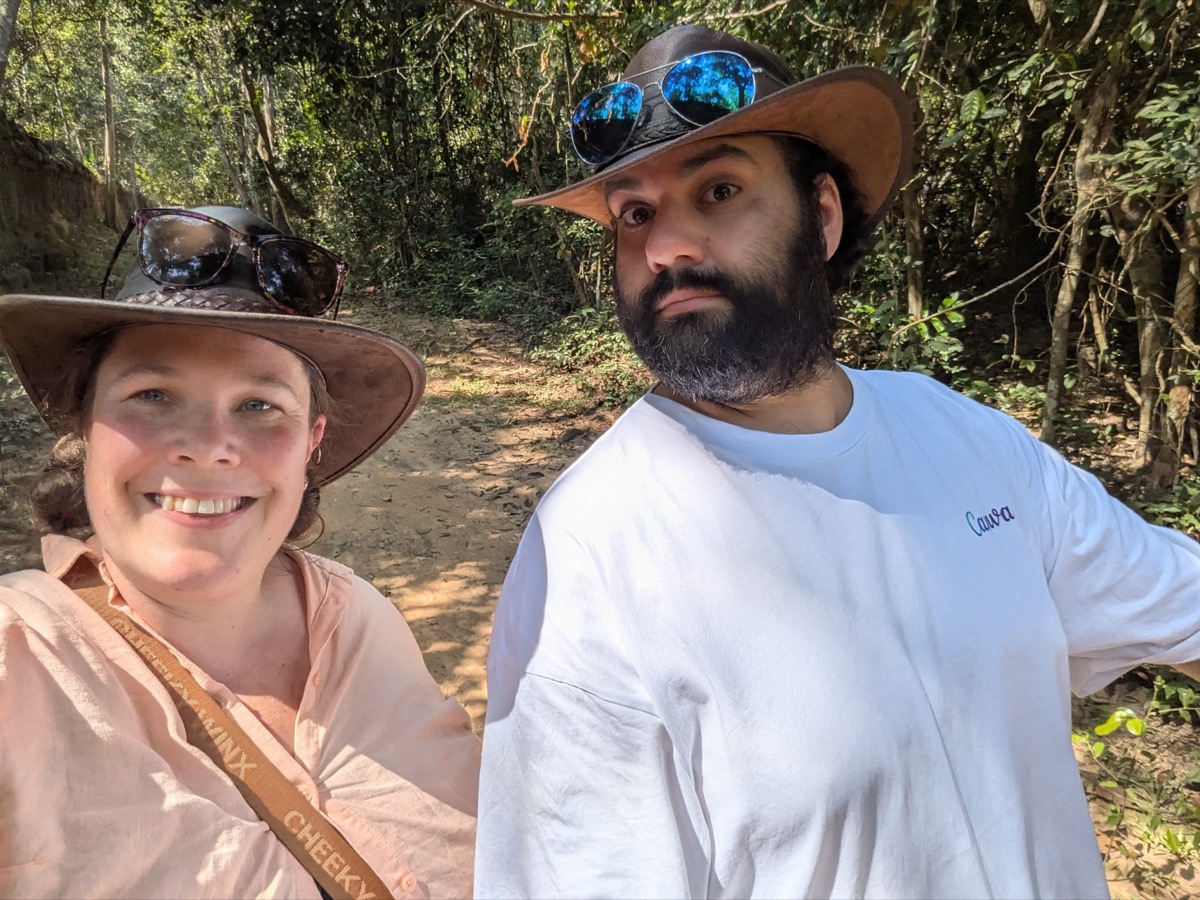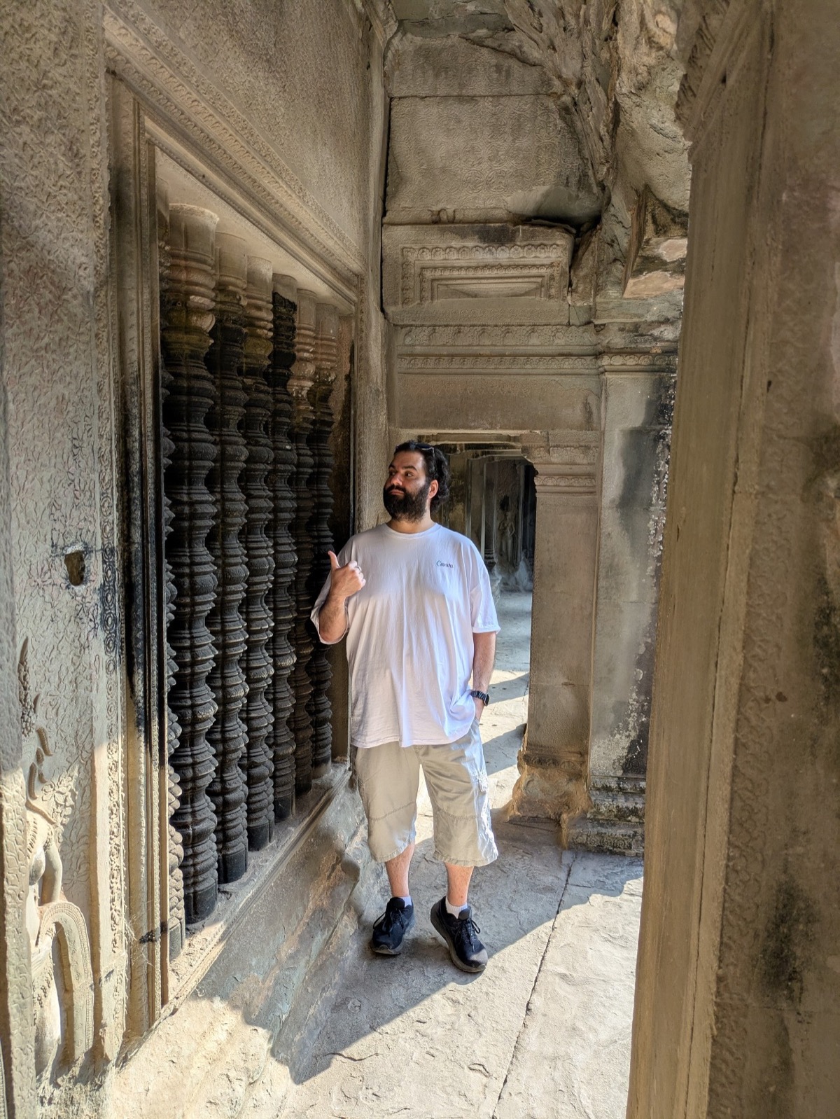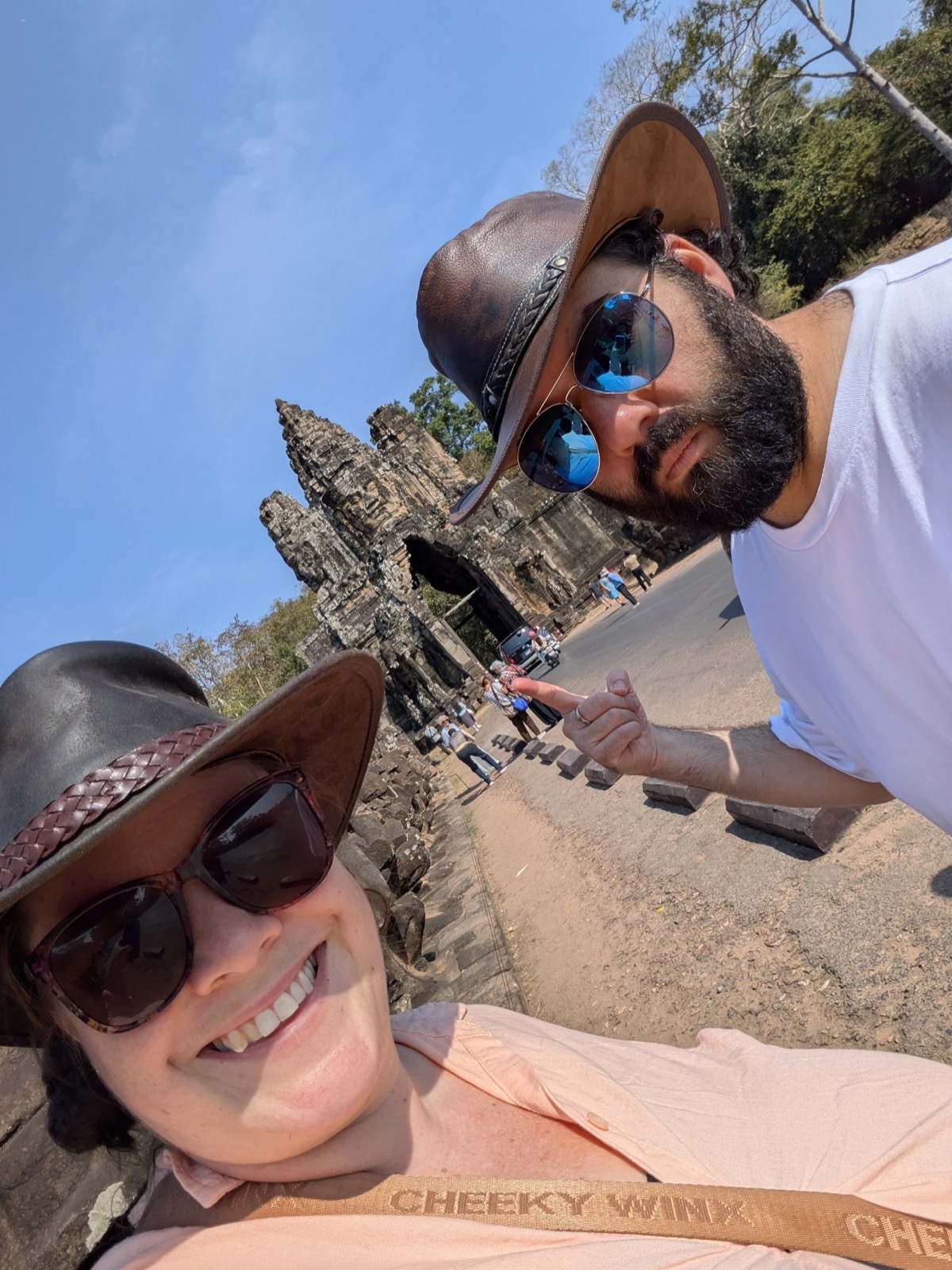 We then explored the site Angkor Wat is the largest religious building in the world and the perfect blend of symbolism and symmetry. It was built as the earthly representation of Mount Meru, the Mount Olympus of the Hindu faith, and the abode of ancient gods. The carvings and details are outstanding. This temple is just part of the Great City of Angkor and the largeness of this is beyond belief for something that was built so long ago with no machinery. We climbed to the top of the tower which is meant to represent Heaven. So many of the statues and motifs have been stolen between wars and occupations which is sad. Mr Neang also showed us where to take some selfies in the absolute centre of the temple. He called it the lucky spot. On the way out of Angkor Wat we had to walk over this floating bridge which I think was the highhlight of Anthony’s day it was so bouncy.