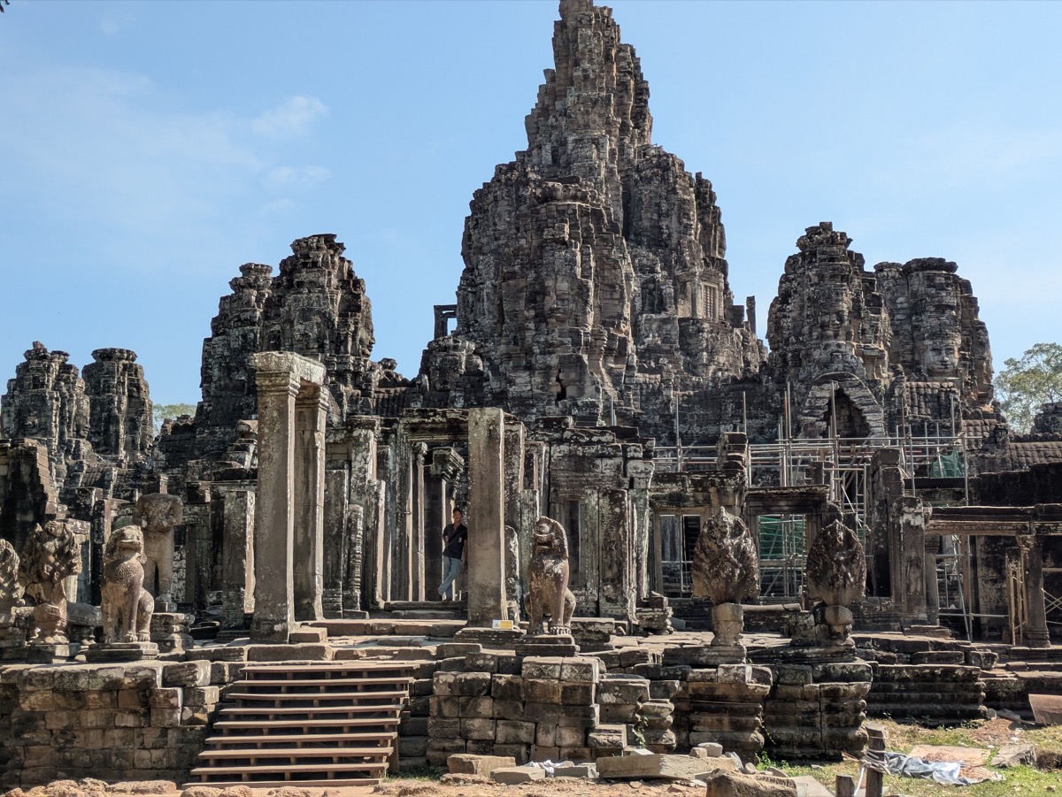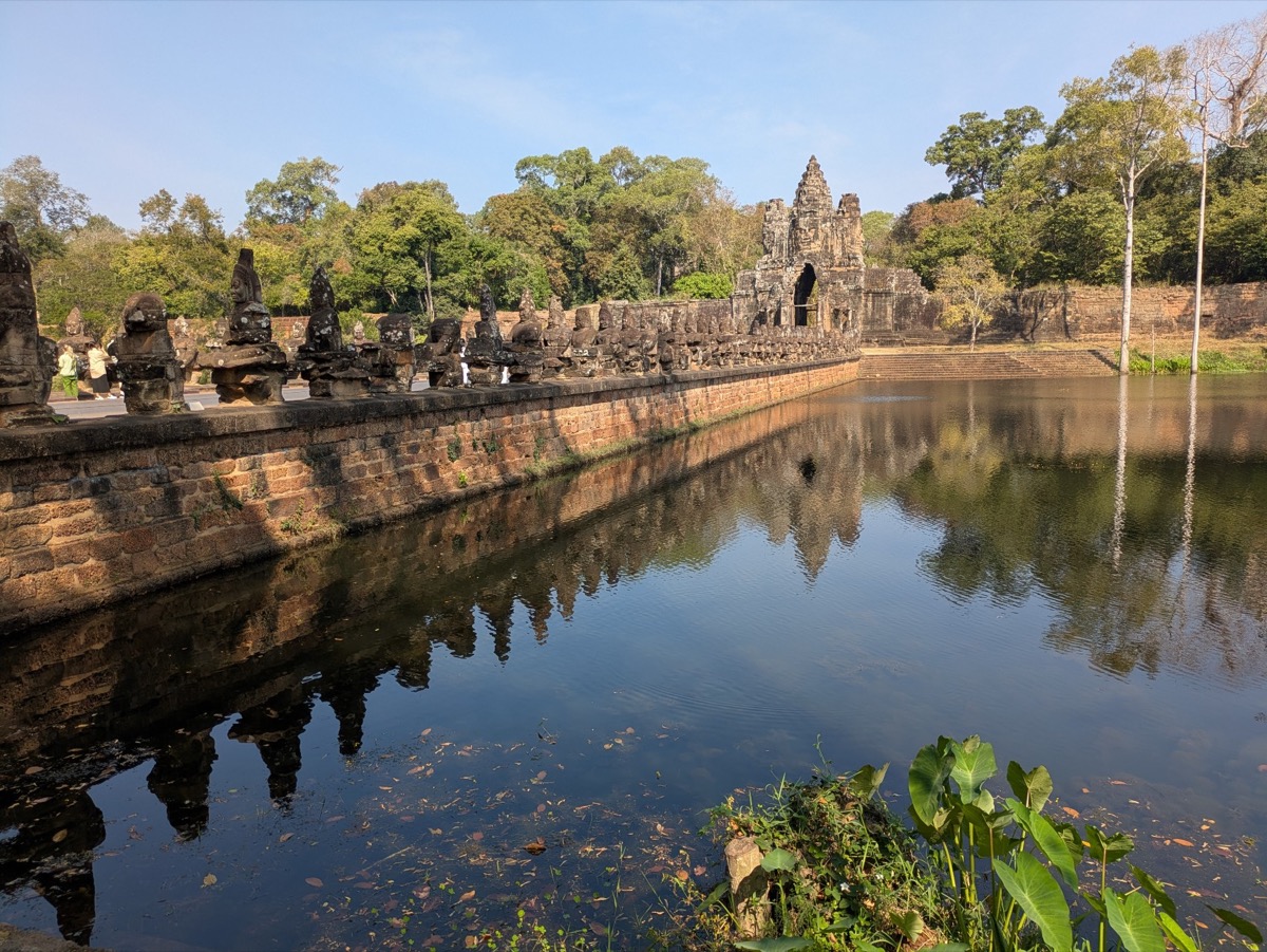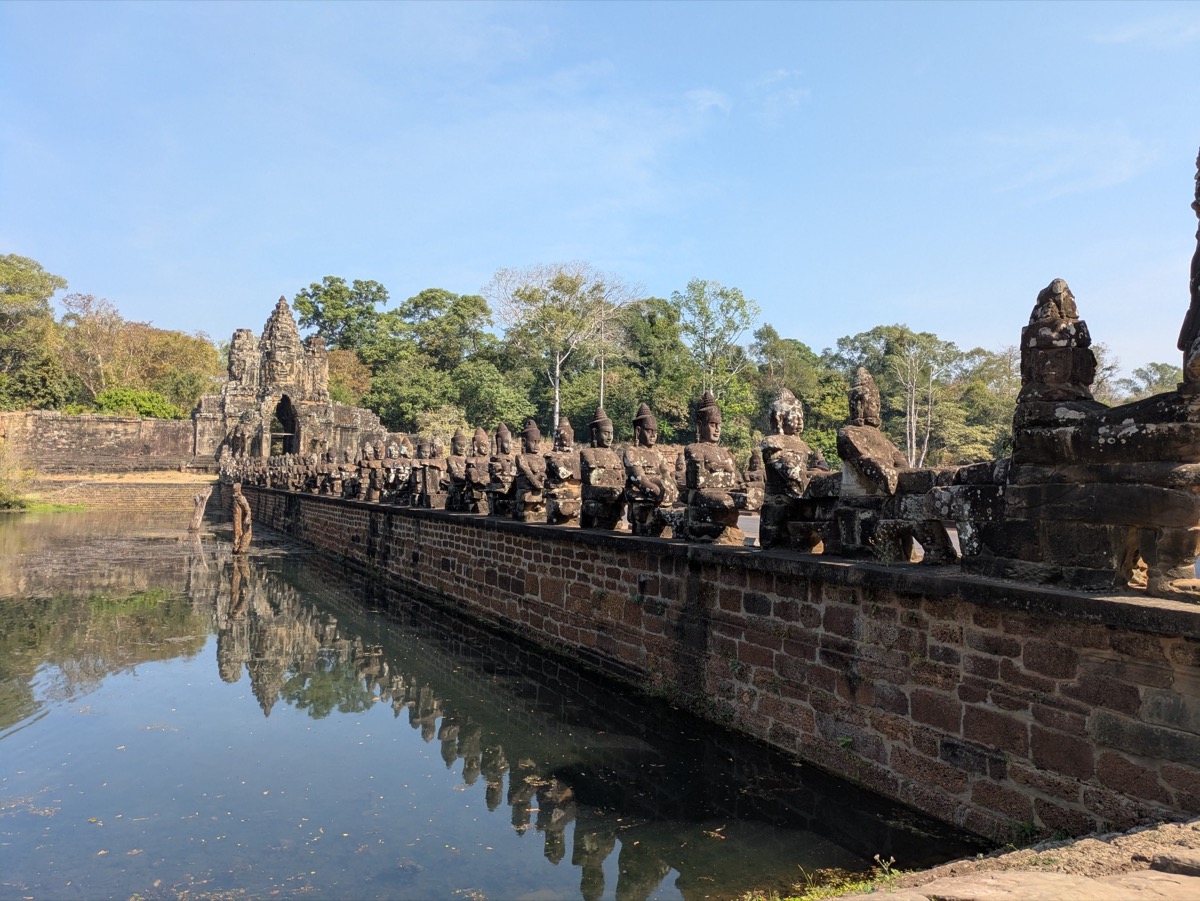 We stopped for a quick breakfast before making our way to the South Gate of Ankor Thom. Angkor Thom, which translates to “Great City” in English, was the capital of the Khmer Empire it was build by the greatest king of the Khmer King Jayavarman VII and includes many other temples and buildings inside it. There is a huge most around Angkor Thom and the road leading to the south gate is lined with statues angels to the west, demons to the east. Mr Neang also explained to us about the wars back in the Khmer Empire and explained that the name Siem Reap means “defeat of the Siam (Thailand nowadays)”. This gateway was amazing to walk through. We were picked up on the other side and driven to our next stop which was the Bayon temple inside Angkor Thom.