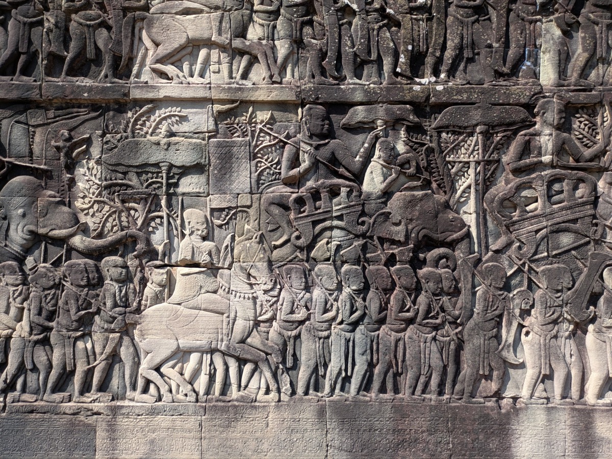 The Bayon temple is known for its 54 Gothic towers that are decorated with 216 gargantuan smiling faces of Avalokiteshvara. We walked through and looked at all the detailed carvings of life back when this was built. It’s showed everything down to the Khmer and the Chinese have gambling during Rooster fights. The details are phenomenal. Entering the actual temple you are greeted with all the beautiful smiling faces. There is a fair bit of restoration work being done here mostly by donations from Japan. This was an awesome temple although from the outside it looks must more like rubble but when you get in close and explore it is stunning. This also the centre of the Angkor Thom city.