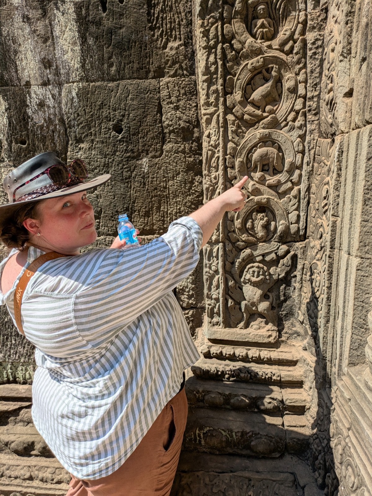 We asked to be dropped back a Tra Prohm as one of my friends was telling us there was a stegosaurus there that we did not see. We headed through the temple again and found what Erin was talking about. It does look like a stegosaurus. Here is some information I found on this bas relief