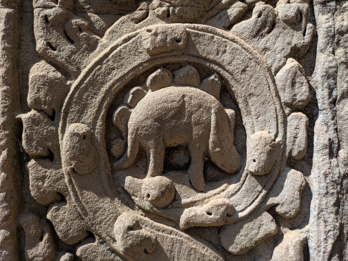 ” Several different theories have been advanced to explain its presence. Some maintain it’s a recently-carved hoax, while others say that the ancient Khmers could have unearthed a fossil and figured out what kind of creature it belonged to. One theory has it that the image actually shows a cow or rhino with a palm tree in the background - the palm’s fronds being easily mistaken for the fin-like blades running down a stegosaurus’s back.”