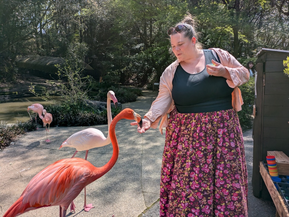 The next crazy thing that happened is we cam across a huge group of Flamingoes. No cages they just have a huge area to hang in. We were allowed to feed them. The flamingos were suprisingly so gentle.