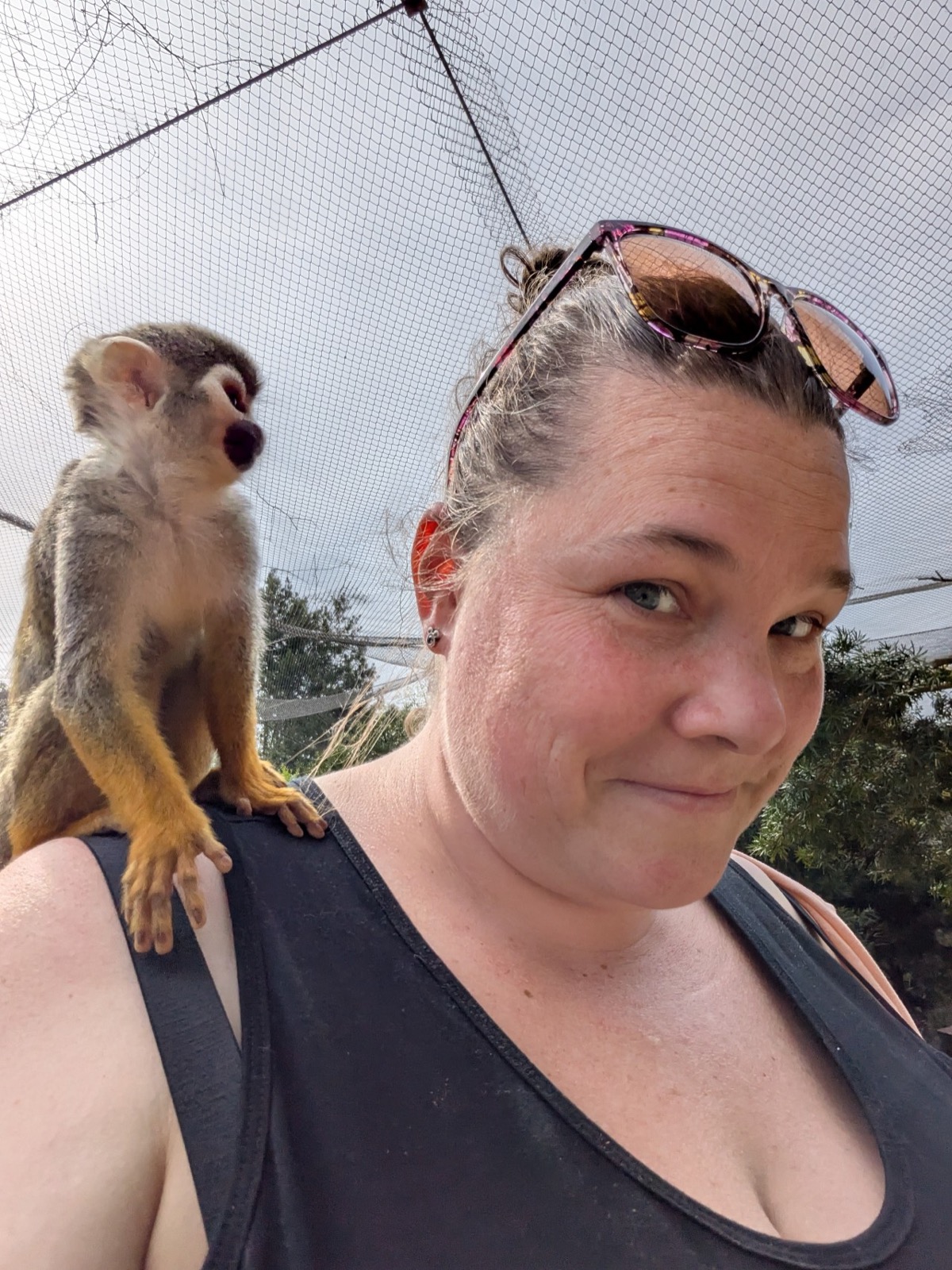 We headed up and fed some raccoons which were also cute. I actually really love raccoons! We also got to go in with the squirrel monkeys. One of which decided I looked like a great ride and jumped on my shoulder and starting pulling my ear.
