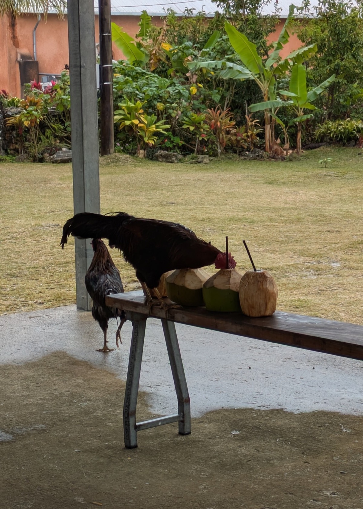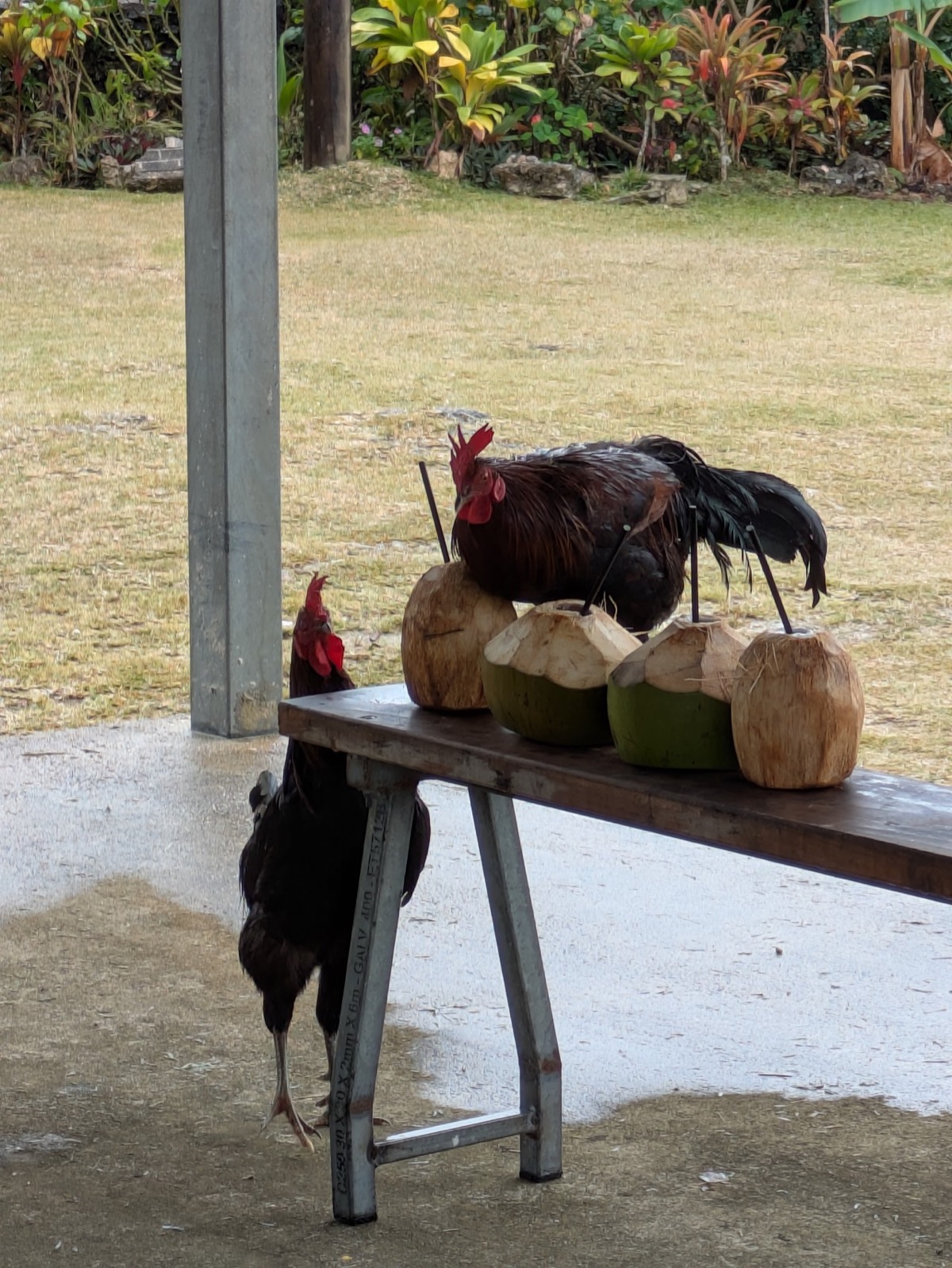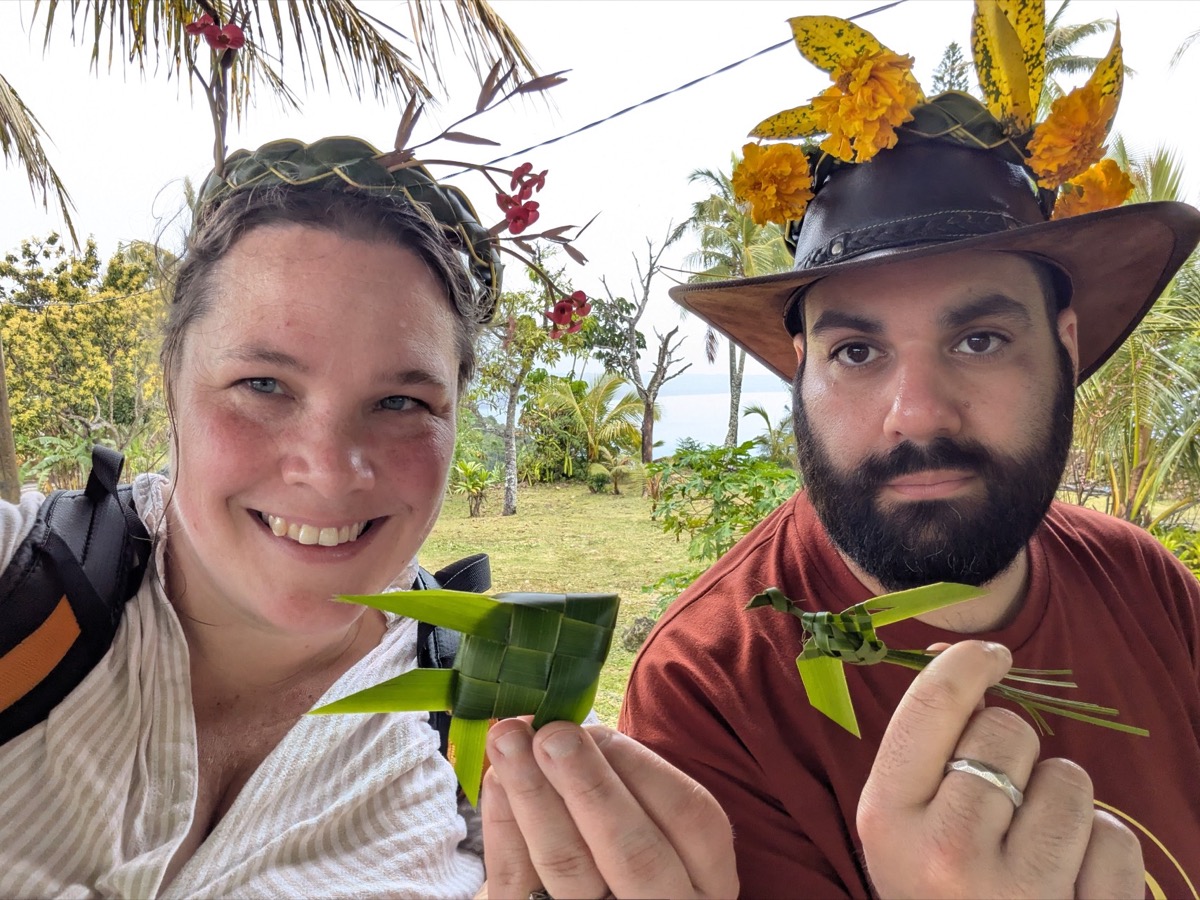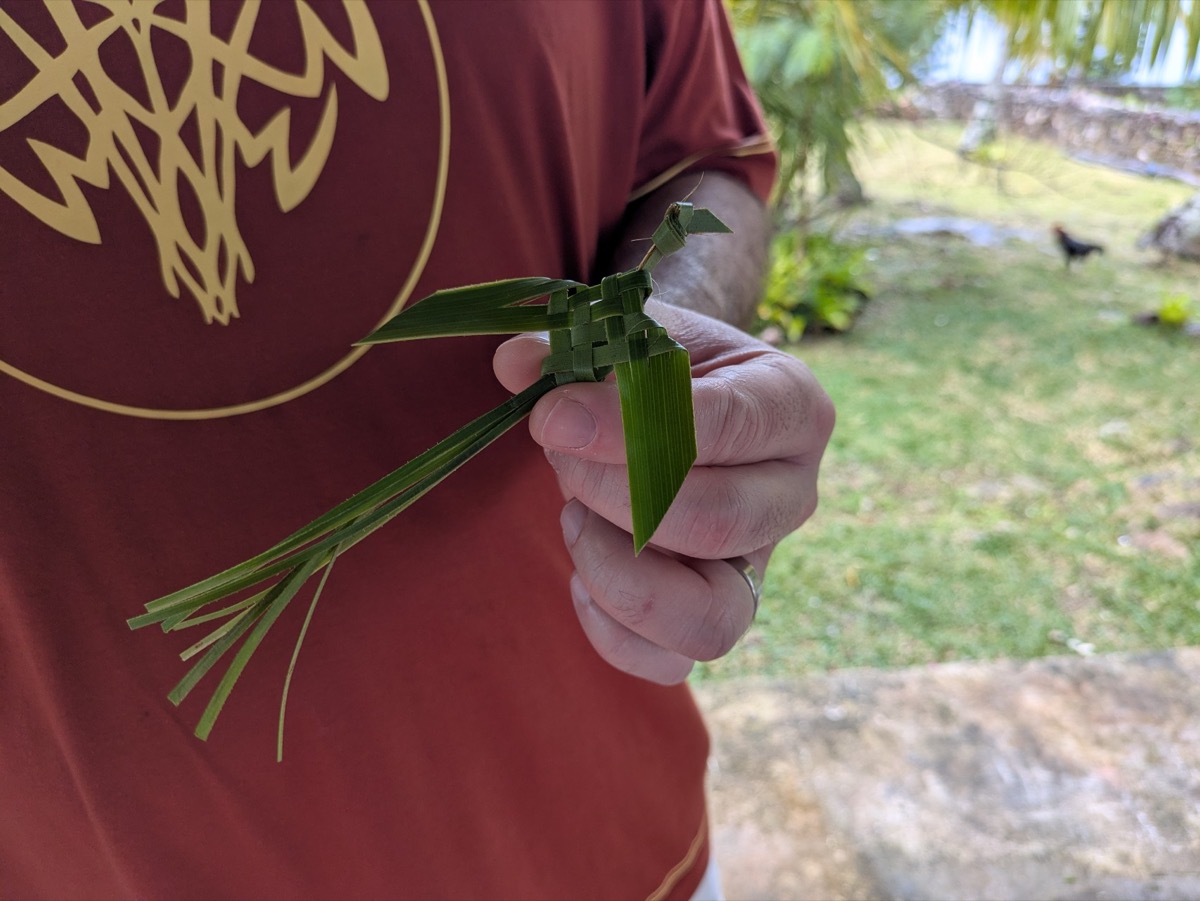 Next to the Jokin cliffs is the sub-chief’s traditional hut. We were welcomed into the undercover area and given a coconut and a weaved Kanak Hat. It was so awesome. Chris and Joe went into the chiefs hut, while Anthony and I stayed to watch the owner of the property weaving. She made us a fish and a bird. We also got to watch the local roosters eat the coconut shells that was left behind which was great.