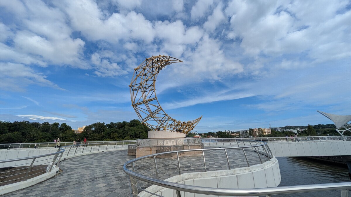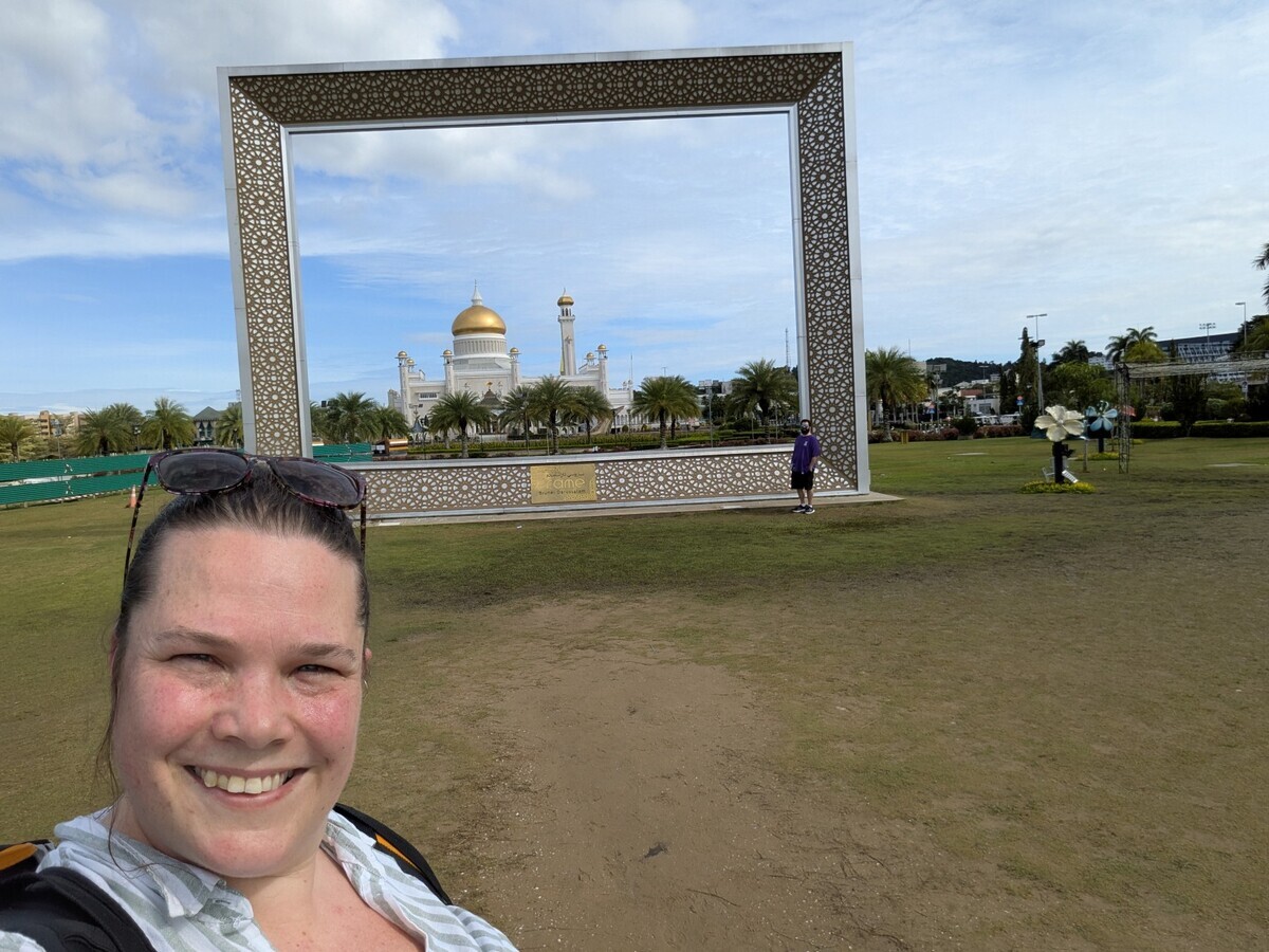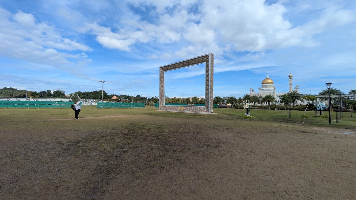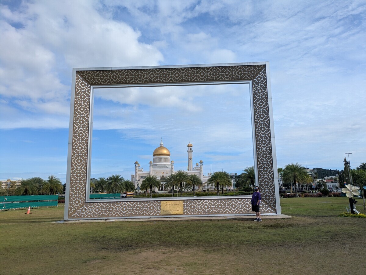 We then headed down into the gardens that surround the mosque and then followed the path along the moat that surrounds the mosque. We spent ages trying to take pictures of the cool reflections. In the distance we saw the Brunei Frame. This is a huge art installation of a giant frame that you look at the mosque though. So we headed over there to take some photos. It was huge!
