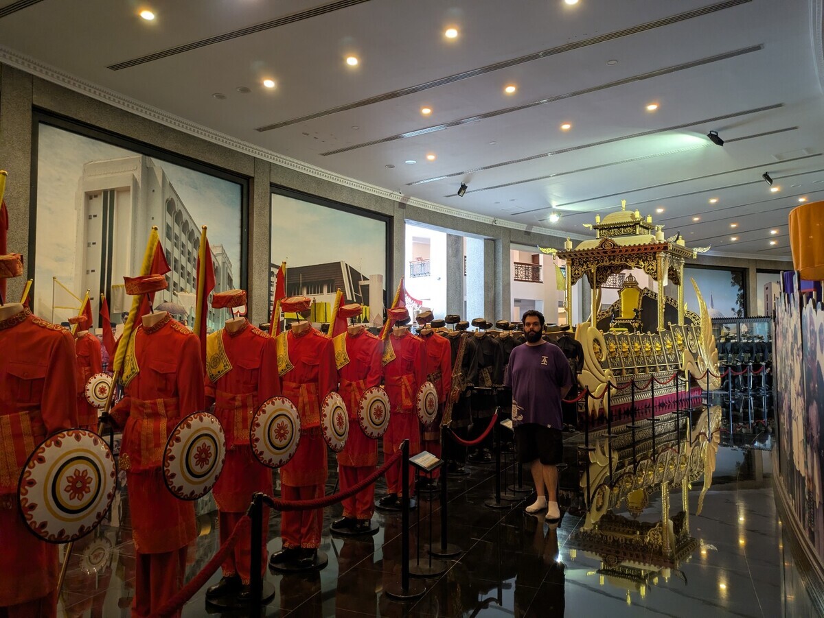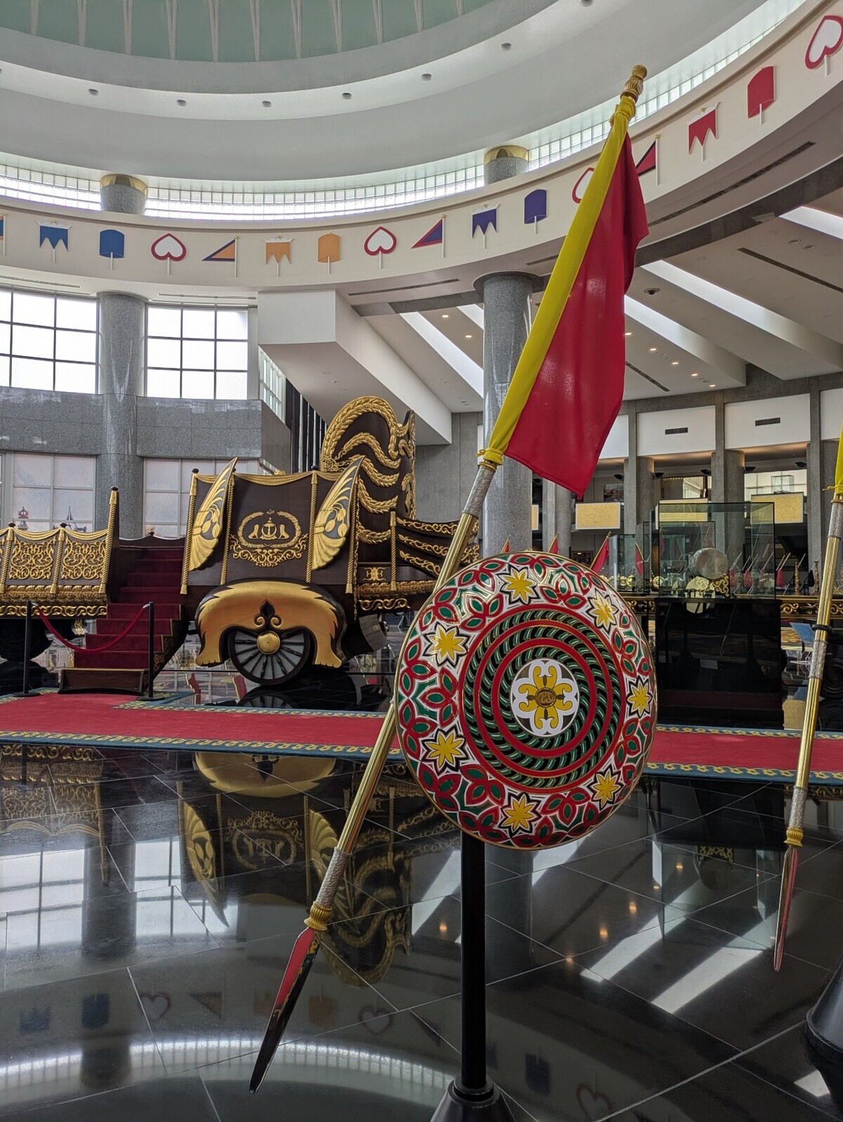 Next stop was to the Royal Regalia Museum. The Royal Regalia Museum is home to the Sultanate’s heirlooms and regalia. We entered and were the only ones there at first. We took off our shoes and stored them (no shoes allowed in the museum). This museum is all about the Sultan and everything about his reign as the Sultan of Brunei. His Majesty Sultan Haji Hassanal Bolkiah has ruled since 1967 and is one of the world’s longest-serving monarchs. Inside the museum, there’s a lot to take in — golden crowns, ceremonial outfits, massive chariots, and gifts from leaders all over the world. Australias gifts were pretty rubbish btw! We got to see the throne and decorations from his coranation as well. Overall it was a super interesting place and we spent much longer then we thought we would in there.