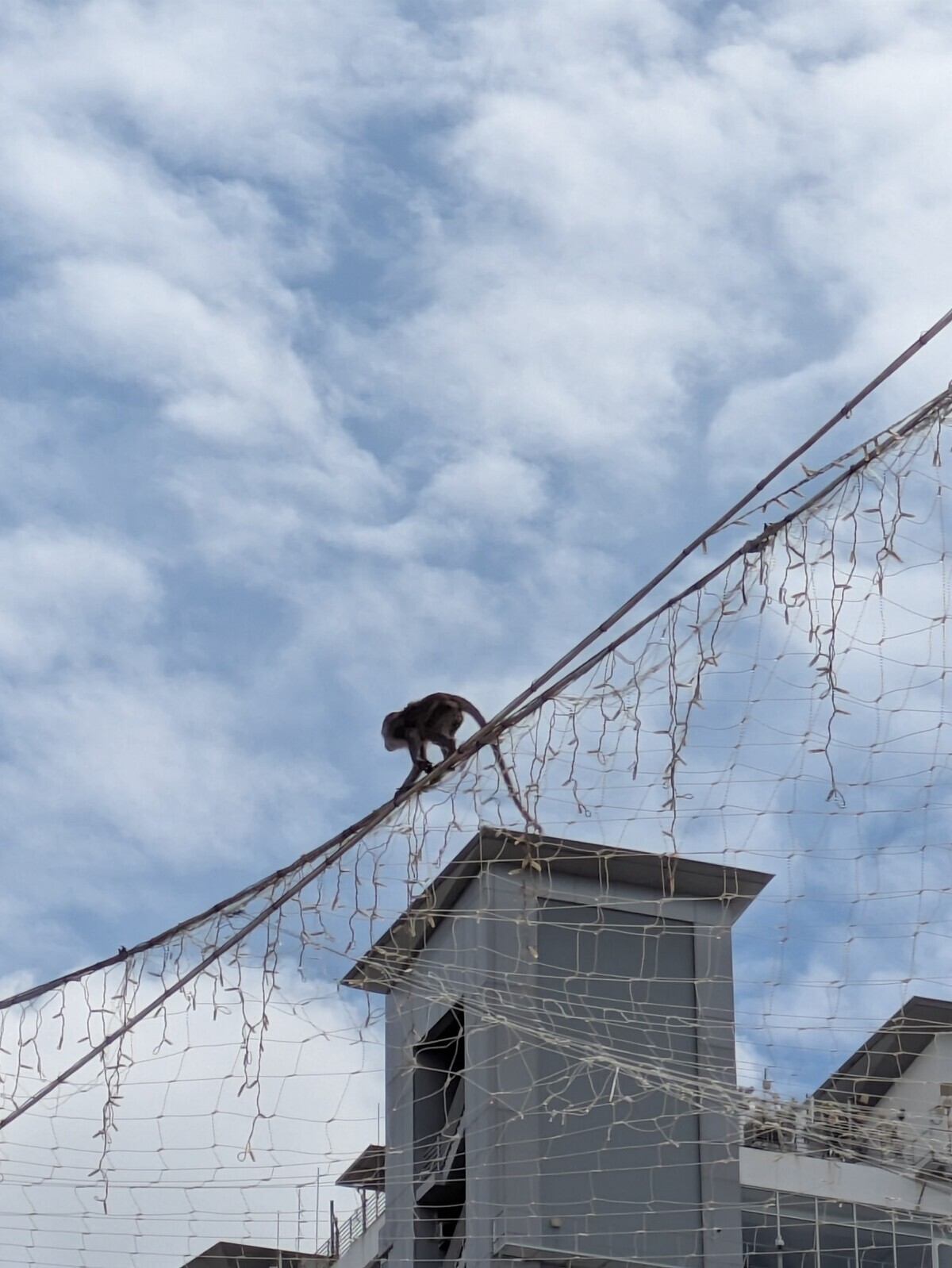 We headed to find some lunch after this. As we were walking down the main road in the city a monkey jumped up onto the pole next to me and ran up to the nets to cross the road. It was so cute.
